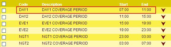 The order of the coverage periods is determined by the Post Time field on the General screen. In the example below, the post time is listed as 0700, and so the DAY1 coverage period is the first one of the day, because it starts on or after that post time. Also, the NGT2 coverage period is posted to the same calendar date as the other coverage periods, even though it is after midnight. So if the DAY1 coverage period started at 0700 on December 1, the NGT2 coverage period would be included in the totals for December 1, even though by calendar it would be December 2.