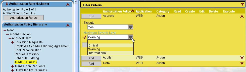 The screen print below shows the location of setting the supervisor access to handle Trade/Offer requests related to the self scheduling features, and also sets the level that supervisors are allowed to override any validation exception messages when approving a requests.