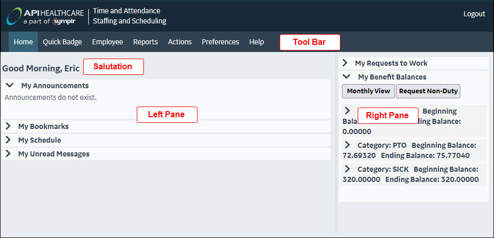 The salutation welcomes you to the application. The name displayed in the salutation can be changed in the Preferred Name field found in Employee > General > General.