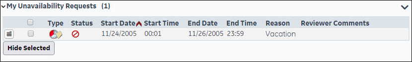 The My Unavailability Requests card opens a listing of your Unavailability and Recurring Unavailability requests. The icon under the Status heading indicates the status of the request. Hover the cursor over the icon to view the status label and the date the status was assigned.